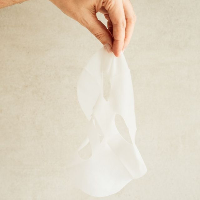 植物ベースの布地と天然ハイドロゲルを組み合わせた素材で、柔らかく薄いシートが肌に密着し、美容液をしっかり保持します。